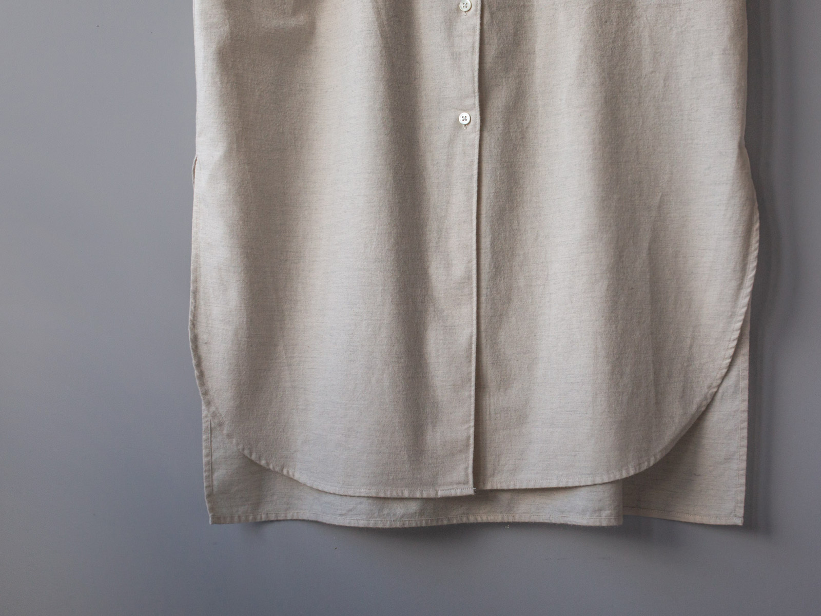 版型為舒適的寬版襯衫向下加長成洋裝樣式,以中性風格為主要印象因此在衣身剪裁上採用果斷俐落的垂直線條,然而在正面下襬處則以緩和的圓弧形作收邊,藉著側開衩將前後下襬的圓弧與方形線條形成對比,為整體增添一絲女性纖細氛圍。